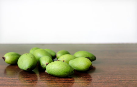 Small green mangoes on a wooden table free space