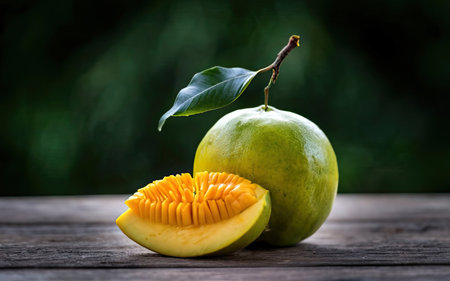 cut spoiled mango on olive wood board