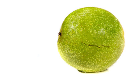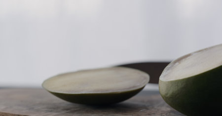 The green outer shells of the unripe walnuts are cut in half, unripe green walnuts