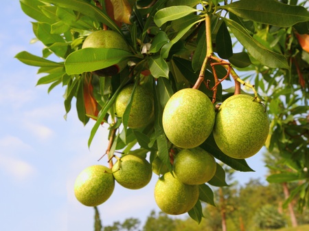 Cerbera oddloam fruit on tree with blue sky.