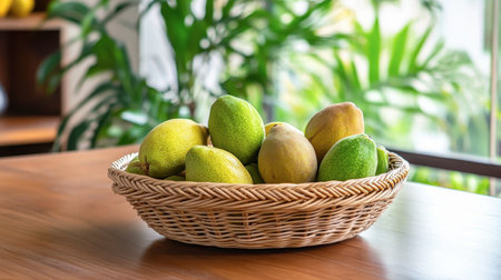 A beautiful basket filled with green and yellow fruits sits on a wooden table, creating a fresh and inviting atmosphere in a lively kitchen surrounded by plants.