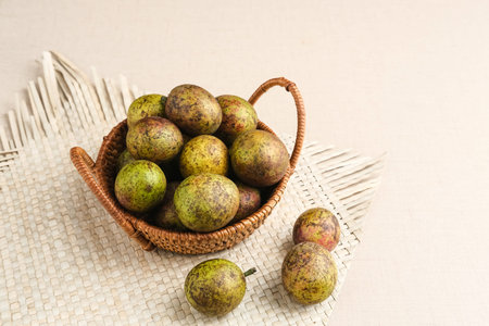 Indian jujube fruit or Ziziphus mauritiana or buah bidara in a rattan bowl. Blurred background
