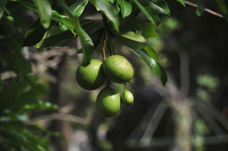 Nutmeg or muscat nuts growth on the tree under a sunny day