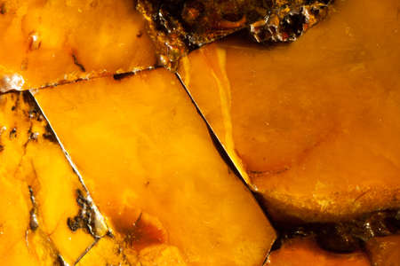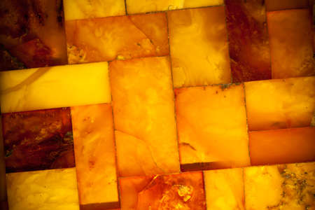 Macro. Closeup of amber mosaic as background texture or backdrop. Golden resin gem.