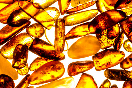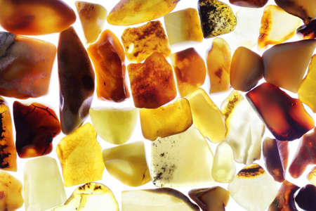 Macro Close up of an amber stones from Baltic sea. Multicolored background for advertising and banners. Vintage fossilized resin as a background. Yellow amber texture close up. Stone with inclusions