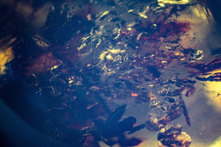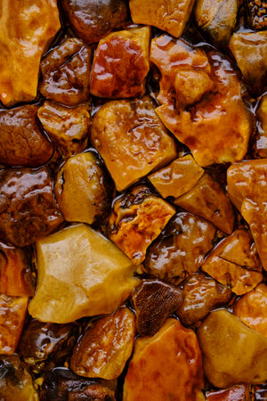 Multi colored granite Texture Mosaic of Natural gemstone Spilled amber in contour sunlight as Aesthetic Abstract background, close up, selective focus. Nature Transparent mineral pieces ancient resin