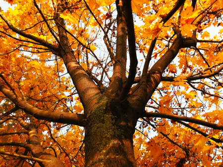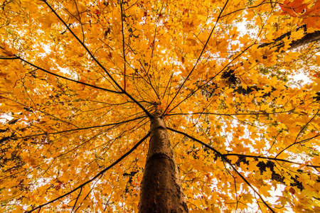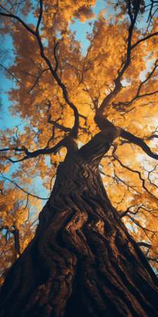 Majestic tree with vibrant golden yellow autumn leaves viewed from below, showcasing beautiful fall season nature transformation.