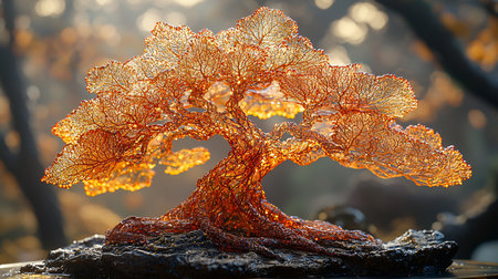 Intricate tree sculpture crafted from copper wire, featuring translucent, leaf-like structures and detailed root system on a dark base.