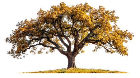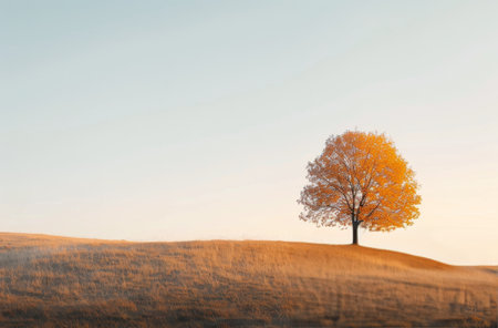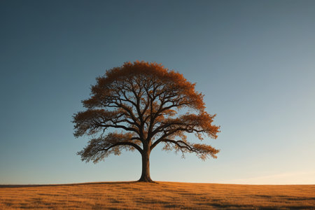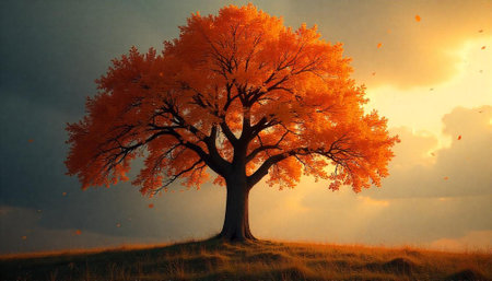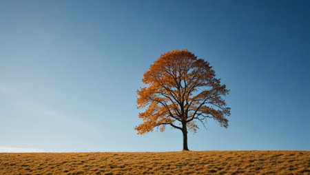 Majestic autumn tree on hill bathed in warm sunlight
