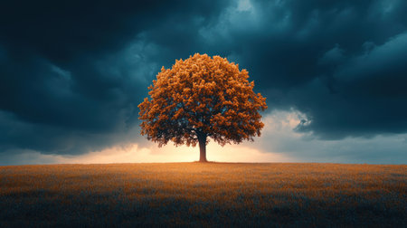 A striking image of single tree standing against dramatic sky, showcasing vibrant orange leaves amidst dark clouds..