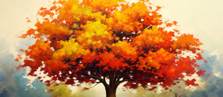 autumn tall tree illustration leaves vibrant, red orange, sky contrast autumn tall tree