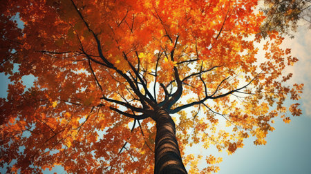 Low angle view of a majestic tree with vibrant orange and red autumn leaves, its branches reaching towards the sky on a beautiful fall day, creating a stunning natural spectacle