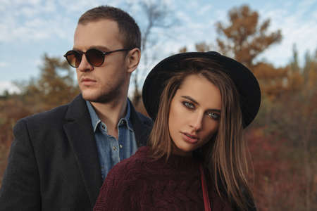 Close-up portrait of a beautiful young people walking in the autumn park. Autumn fashion.