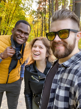 Three friends enjoy a sunny day in the forest, capturing moments and smiles. Selfie and diversity concept