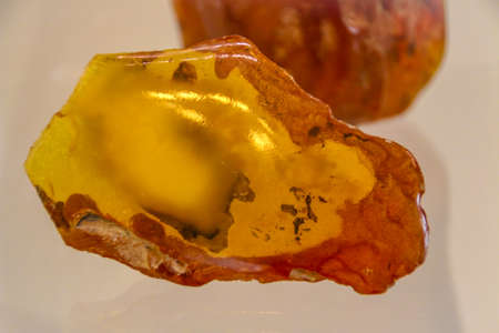 Macro. Closeup of amber as background texture or backdrop. Golden resin gem.