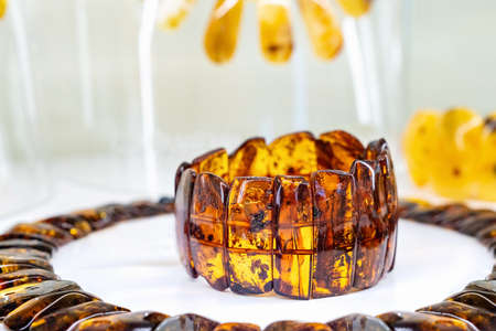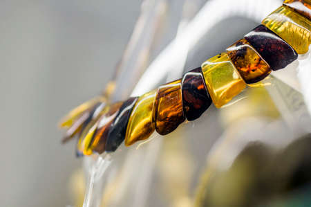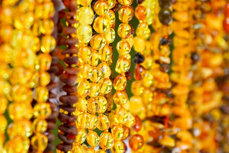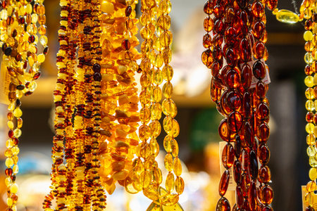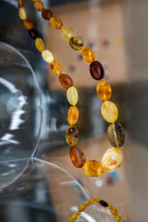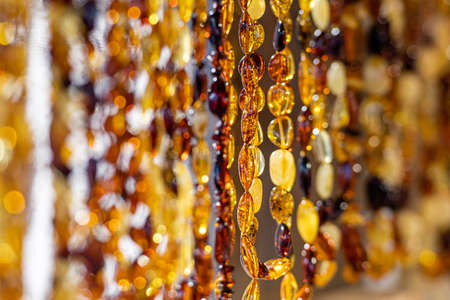 Amber background of beads and necklaces at the handicraft market. Traditional Souvenirs From Baltic Countries, selective focus - image