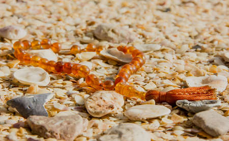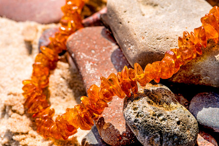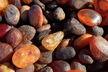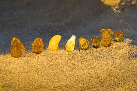 A few natural, polished Baltic ambers on a sandy beach in the rays of the setting sun. Kolobrzeg, Poland.