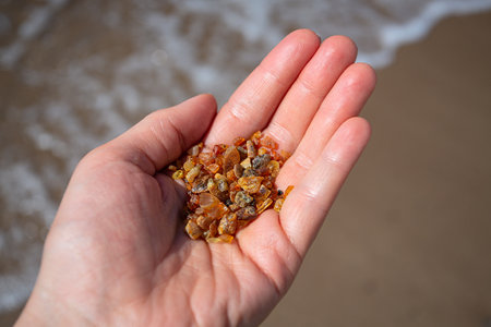 Some pieces of amber found on the Baltic seashore on hand close up cold sea in background