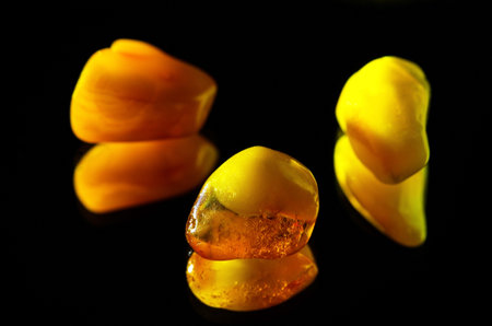 Raw amber from the shores of the Baltic Sea. Pieces of raw amber lie on black glass. Raw material for the production of jewelry.