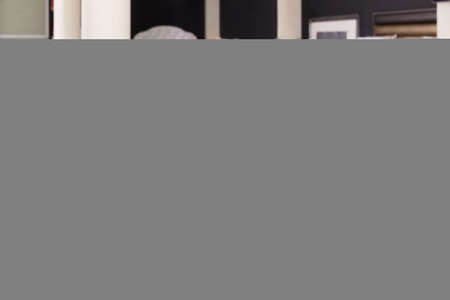 Large, framed portrait photo and a monstera plant in a classic workspace interior with an orange lamp on a wooden desk