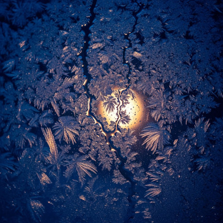 Intricate ice crystal formations on frozen windowpane, abstract macro photography, cold morning light.