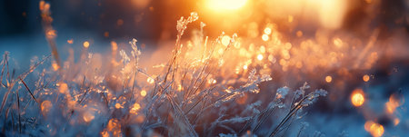 Frosty grass glistens in the early morning sunlight at a serene winter landscape