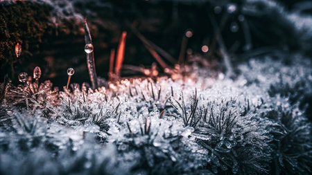 Frost-covered plants glistening under soft winter light creating a magical winter atmosphere