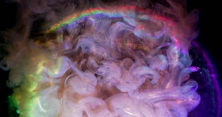 Rainbow shimmering. Colorful fume. Glossy smoke wave liquid paint glowing on dark sparkling abstract background water blur circle lens.