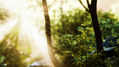 Bright sunlight beams filter through thick green foliage and branches in a misty forest creating an ethereal and serene natural atmosphere