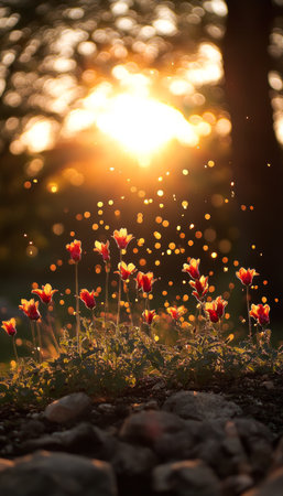 Golden Hour Bloom Backlit Red Wildflowers in a Lush Meadow, Scenic Nature Background