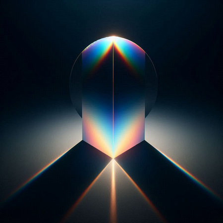abstract background with rainbow-colored light refractions and glowing prism effects on dark backdrop.