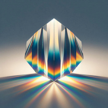 A stunning glass prism casting vibrant rainbow reflections on a surface, creating a mesmerizing pattern of colors and light. Perfect for artistic projects.