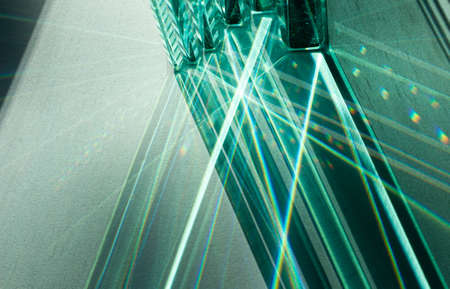 Abstract background with glass geometric figures prisms with light diffraction of spectrum colors and complex reflection.