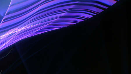 Night neon waves. Stormy glowing 3d ultraviolet render with ocean wave mesh. Futuristic purple web digital city lights in reflection. Meditative water rhythms natural energy