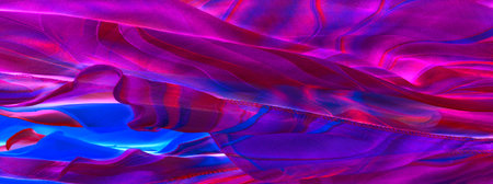 Texture, background, pattern. Silk fabric is transparent, yellow-pink green in blue. Abstract soft chiffon texture background.