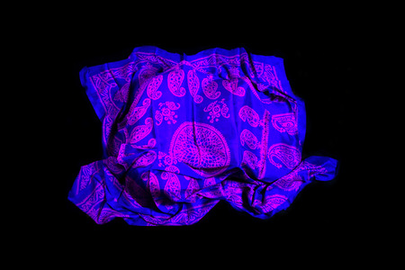 Fluorescent background. Crumpled texture. Distressed glowing paper. Neon uv led magenta pink purple blue color gradient light on bright wrinkled abstract overlay.