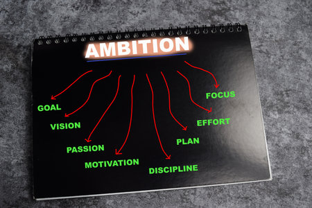 Concept of Ambition write on book with keywords isolated on Wooden Table.