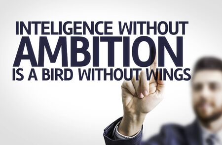 Business man pointing to transparent board with text: Intelligence With our Ambition is a Bird without Wings