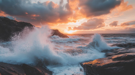 A stunning view of tranquil ocean waves reflecting a golden sunset, creating a serene atmosphere. The beautiful scenery captures the beauty of nature and peace.