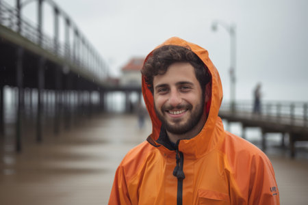 rear view of man wearing hooded sweater and jeans looking at the sea