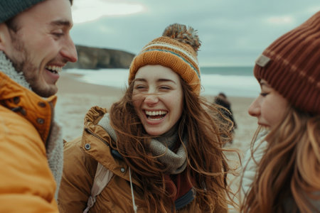 Four joyful friends laughing on a windy beach day, with wild hair and casual clothing, embodying happiness and friendship.