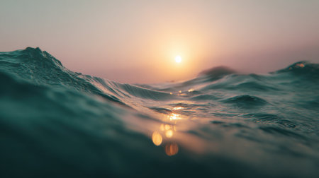 A serene view from just below the waters surface, capturing the gentle movement of teal waves as the golden sun sets, creating a beautiful and peaceful natural scene.