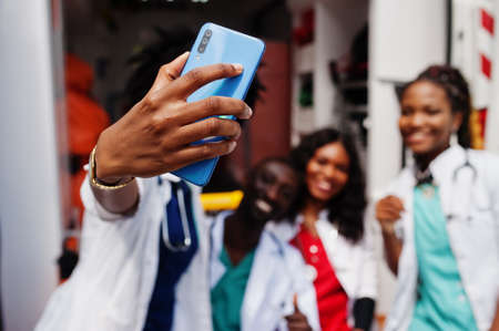 Group of african paramedic ambulance emergency crew doctors making selfie on phone.