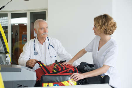 Man breathe through oxygen mask, nurse in uniform opens something taken from medical bag in the ambulance car