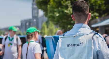 Lourdes, FRANCE, June 22, 2017 - pilgrims heading towards the miraculous water pools of Lourdes, France