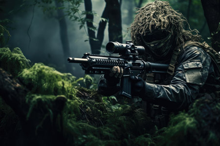 Deep within a dense, moss-covered forest, an elite sniper lies perfectly still, concealed in a ghillie suit. Blending seamlessly with the natural terrain, they patiently watch their target, a silent and unseen guardian embodying the essence of stealth and precision.