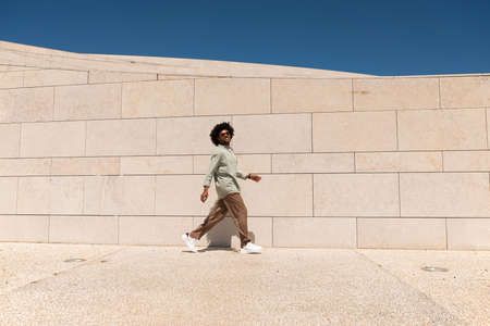Stress-free Black man outdoor. African American man in casual clothes and sunglasses walking on sunny day. Portrait, city life concept