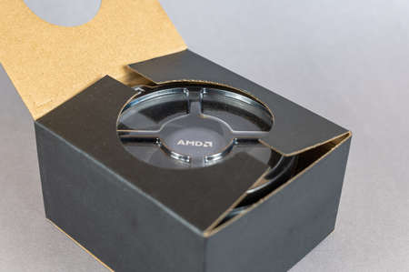 New AMD CPU cooler is in black cardboard box. Advanced Micro Devices Inc. AMD is an American multinational semiconductor company based in Santa Clara, California. Ukraine, Mykolayiv - 02 09 2022