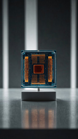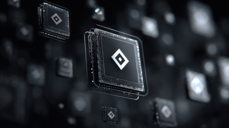 Explore the mesmerizing world of technology with floating microchips captured against a dark background, representing the future of digital advancement and innovation.