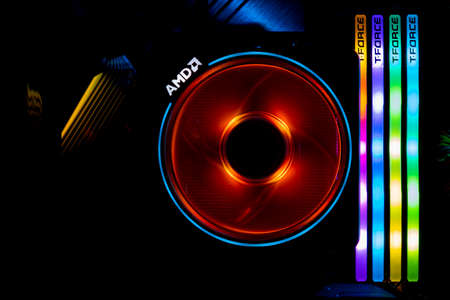Chonburi, Thailand - MAY 16, 2020: The colorful of AMD Wraith Prism Cooler for CPU Ryzen9 3900X with four T-Force DELTA RGB DDR4 DIMMs in the computer case.